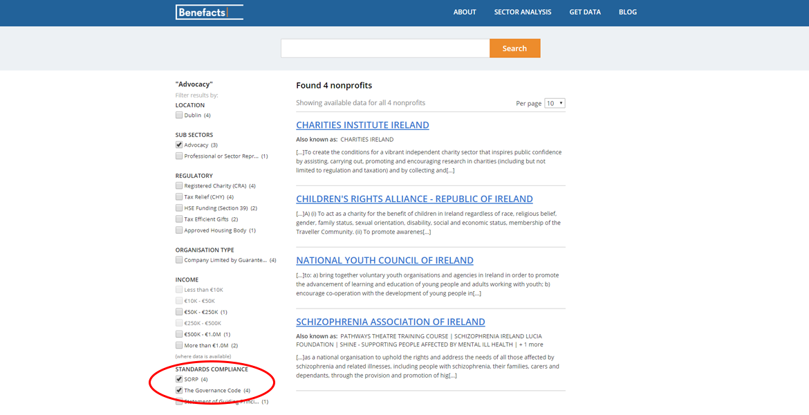 Benefacts.ie is the only source of up to date analysis of all nonprofits (charities or otherwise) adopting the three standards (SORP, Governance Code and Statement of Guiding Principles for Fundraising). Use the facets on the left-hand side of the Benefacts search results screen to select which reporting standard you're interested in - see image for example.